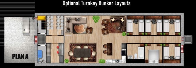 Alternately, customers can pay $15,000 to secure a space in a shared bunker. These are “completely furnished, outfitted, stocked with 1 year of food and supplies, dishware, linens, fuel, water, and bedding, with a deluxe private bunk with keyed access. Perfect for singles, couples and small families to share with others.”